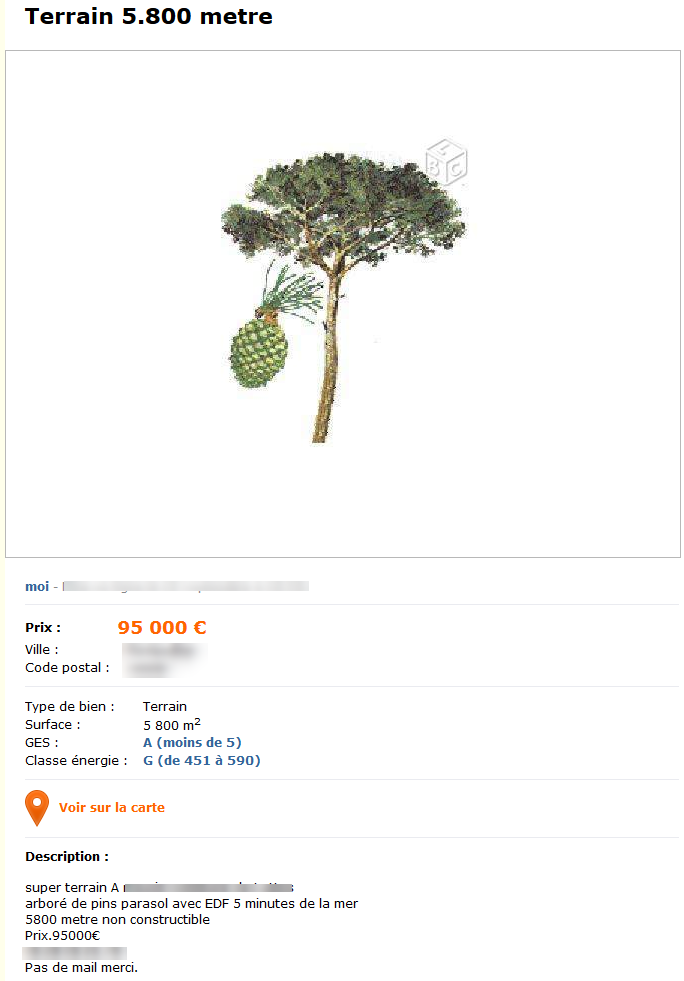 D’abord, le titre est totalement flou. « Bâtiment en pierre ». D’accord. Quel genre de bâtiment ? Combien de lots/pièces ? Quand on est dans la liste des annonces, on ne sait rien. C’est la surprise. Et quelle surprise… Le texte donne totalement envie de ne pas acheter ce « bâtiment en pierre ». C’est juste une énumération de tous les mauvais points du bien, faite de la manière la plus péjorative qui soit (évitez les « pas » brutaux, préférez les « absence de raccordement à », plus élégants). Cependant, ce texte possède l’exploit de ne posséder qu’un seul verbe en 5 lignes. Du talent. Vu la capacité de l’auteur à s’exprimer par écrit, je ne suis pas sur que je veuille le « contacter par mail ». Et enfin, la photo. Sainte mère de Dieu, la photo. Aucune photo du bien. Juste une simple image d’ardoise floue avec marqué « A vendre ». Je suis censé débourser 55 000€ (plus de deux fois le prix de SuperTerrain, qui me fait bien plus envie) pour une foutue ardoise pompée à l’arrache sur le net. Sincèrement, tapez « a vendre » (oui, sans l’accent, tant qu’a faire les choses bien) dans Google Images, à l’heure où j’écris ces lignes, c’est le cinquième résultat.