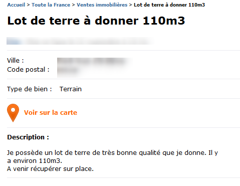 Pour le coup, c’est du gâchis, parce que le bien avait l’air vraiment attirant. Regardez ces photos : bonne qualité, bonne prise de vue, ça ressemble à un petit paradis ! Qui n’aimerait pas aller se balader dans ce jardin vert et s’allonger dans l’herbe avec un bon bouquin ? La maison parait assez grande, le terrain immense… Même si le titre ne l’indique en rien. Quand soudain, on tombe sur le texte d’annonce. En le lisant, je me suis fait un claquage du Bescherelle. J’étais en plein rêve éveillé dans cette jolie maison et je me suis pris une brique de réalité dans la tête. Douloureux. Cette annonce m’a fait le même effet que quand ma mère me préparait du gratin quand j’étais petit et que, après avoir patienté 30 minutes devant le four en salivant, je réalisais que ce n’était pas un gratin de pommes de terre mais de choux-fleurs… Un ascenseur émotif qui lui vaut l’ImmondeActu Award d’argent.
